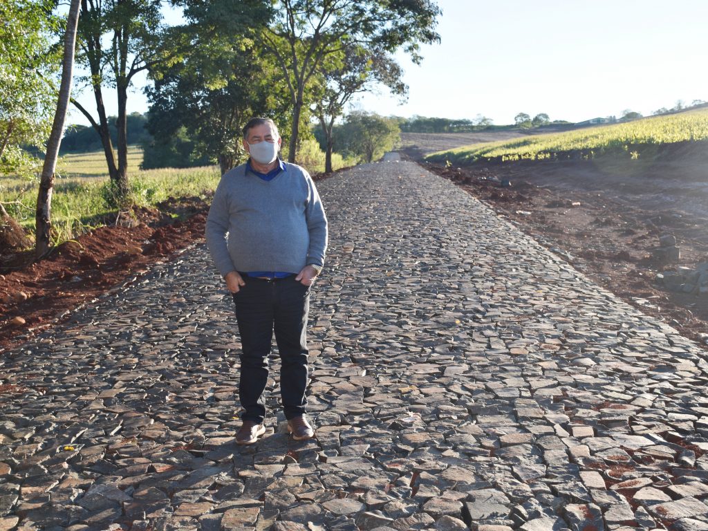 Uma das obras é no trecho entre a PR-497 e o entroncamento da linha Urussanga, na região da propriedade da família Burigo, onde está sendo executada a pavimentação poliédrica em uma extensão de 2.570 metros, através de uma parceria com a Itaipu Binacional.
