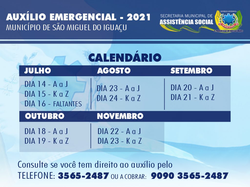 O Governo Municipal de São Miguel do Iguaçu, através da secretaria municipal de Assistência Social, definiu as datas para a entrega do Auxílio Emergencial para pessoa economicamente vulnerável, em decorrência da Emergência de Saúde Pública de importância internacional, causada pela infecção humana pelo novo Coronavírus (Covid-19).