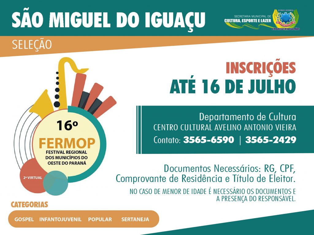 A secretaria municipal de Cultura, Esporte e Lazer de São Miguel do Iguaçu, através do departamento de Cultura, está com inscrições abertas para interessados em representar o município no 16º Festival Regional dos Municípios do Oeste do Paraná, o Fermop.