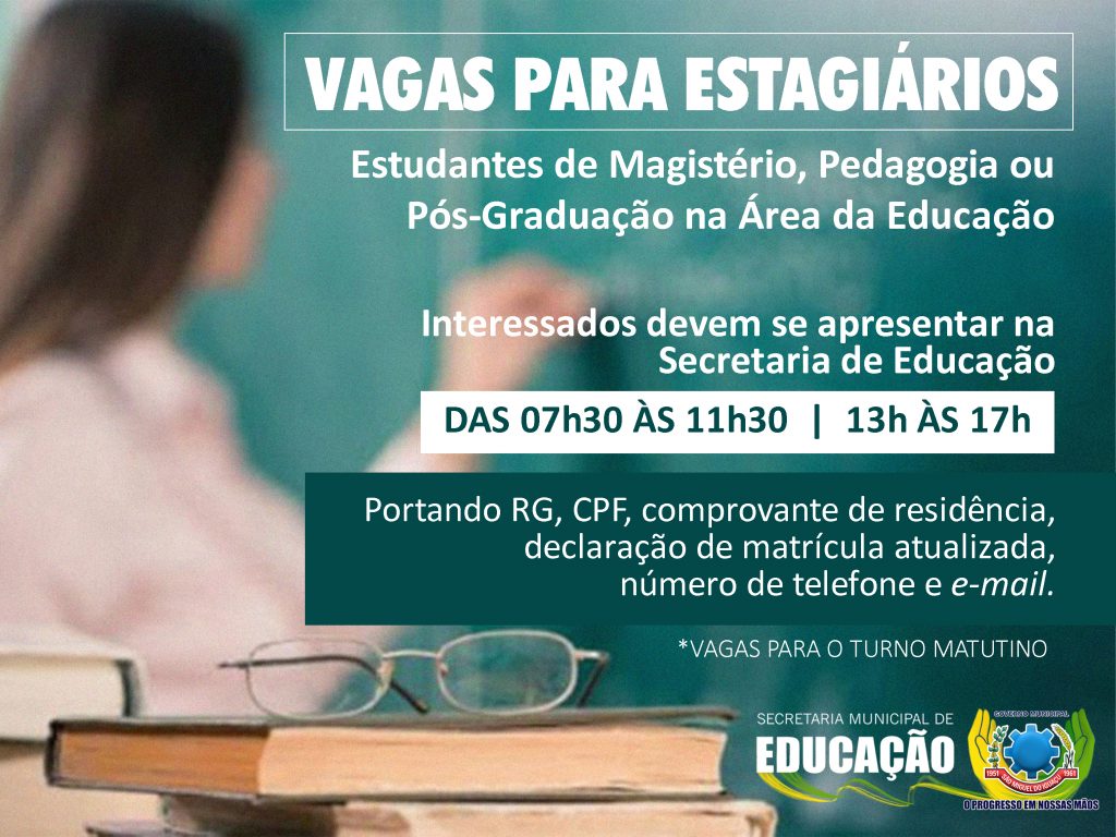 O Governo Municipal de São Miguel do Iguaçu, através da secretaria de Educação, está com vagas abertas para estagiários que desejam trabalhar na Rede Municipal de Ensino.