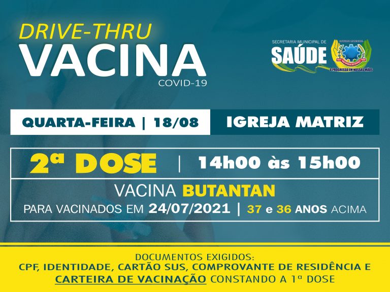A vacinação será realizada na Igreja Matriz, no horário das 14h00 às 15h00, seguindo o modelo drive thru, com a pessoa sendo imunizada dentro do carro. Para receber a dose é obrigatória a apresentação da carteirinha com a 1ª dose, além de RG, CPF, cartão do SUS e comprovante de residência.