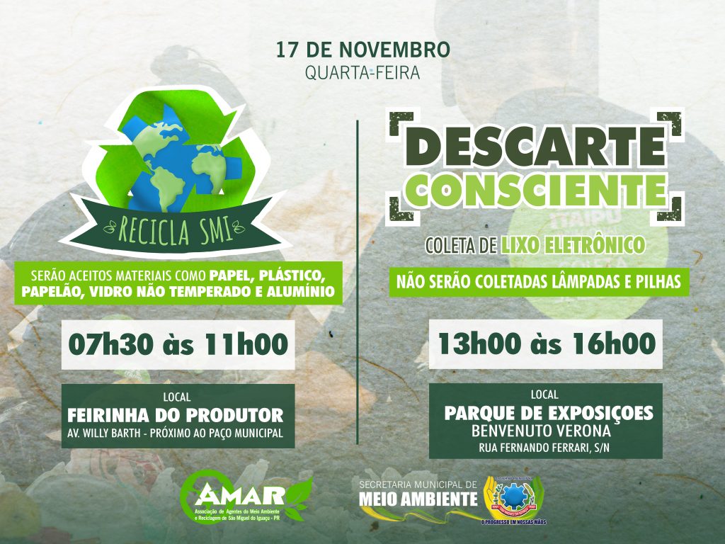 O Governo Municipal de São Miguel do Iguaçu, por meio da secretaria de Meio Ambiente, realiza nesta quarta-feira, 17 de novembro, em parceria com a Associação de Agentes do Meio Ambiente e Reciclagem de São Miguel do Iguaçu (AMAR), mais uma etapa das campanhas ‘Descarte Consciente’ e ‘Recicla SMI’.