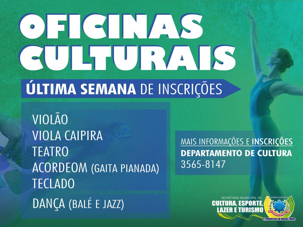 O Governo Municipal de São Miguel do Iguaçu, por meio da secretaria de Cultura, Esporte, Lazer e Turismo, comunica que essa é a última semana de inscrições para as oficinais culturais de violão, viola, gaita, teclado, teatro e balé. As inscrições são gratuitas e devem ser feitas de forma presencial no Centro Cultural Avelino Vieira, das 07h30 às 11h30 e das 13h00 às 17h00.