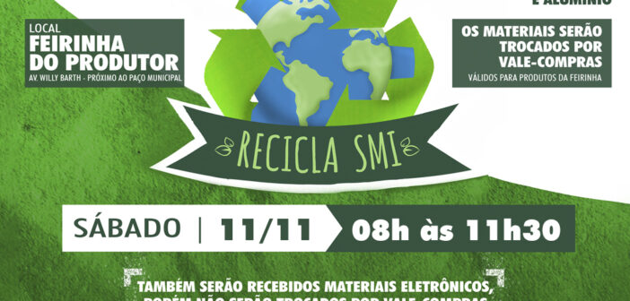 O Governo Municipal de São Miguel do Iguaçu, por intermédio da secretaria de Meio Ambiente, vai realizar neste sábado, 11 de novembro, em parceria com a AMAR (Associação dos Agentes de Meio Ambiente e Reciclagem) e os feirantes da Feira do Produtor, a edição mensal da campanha Recicla SMI.