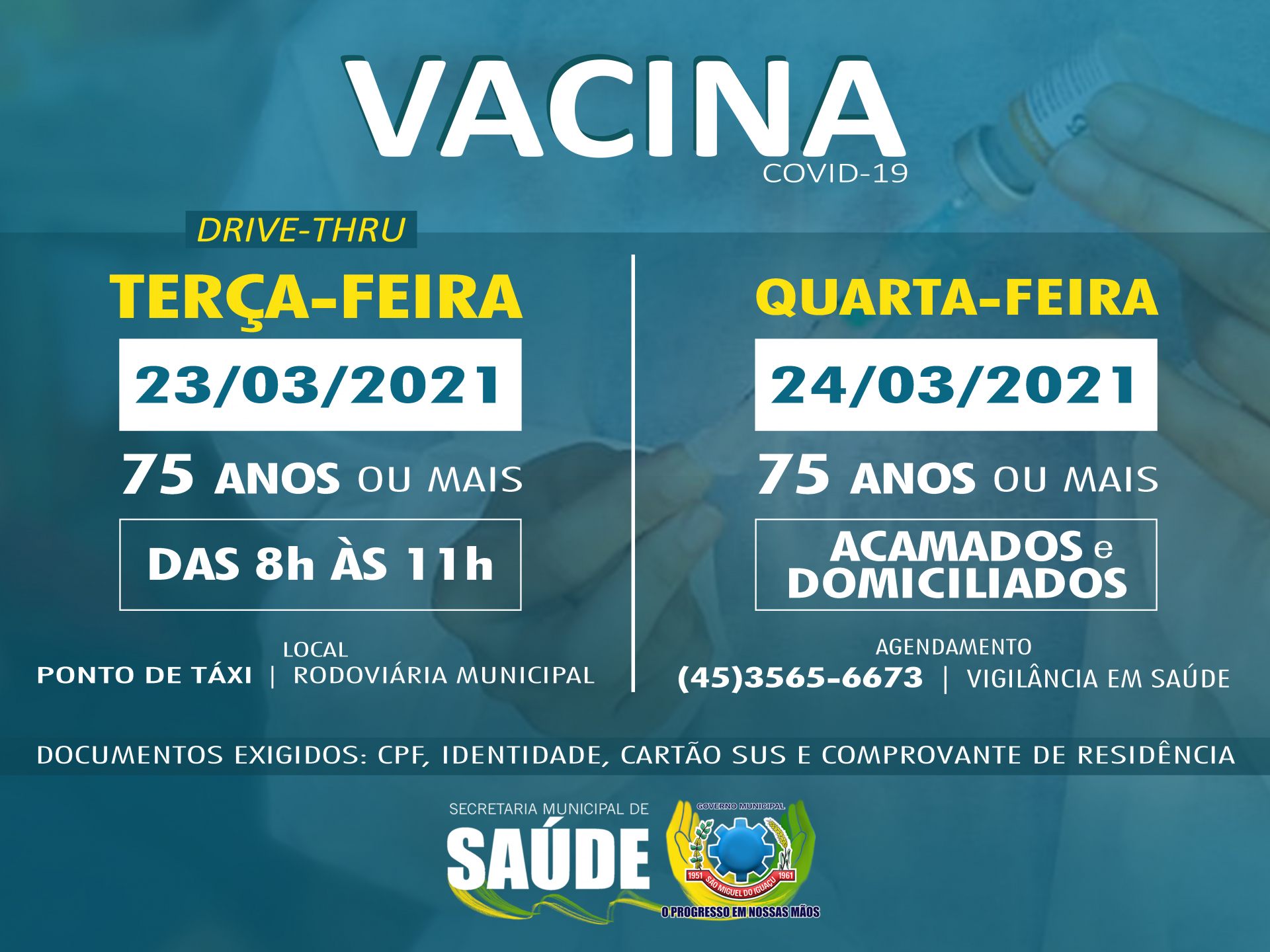 A vacinação será realizada mais uma vez no Ponto de Táxi da Rodoviária Municipal, no sistema drive thru, com o idoso sendo vacinado dentro do carro, no horário das 08h00 as 11h00.