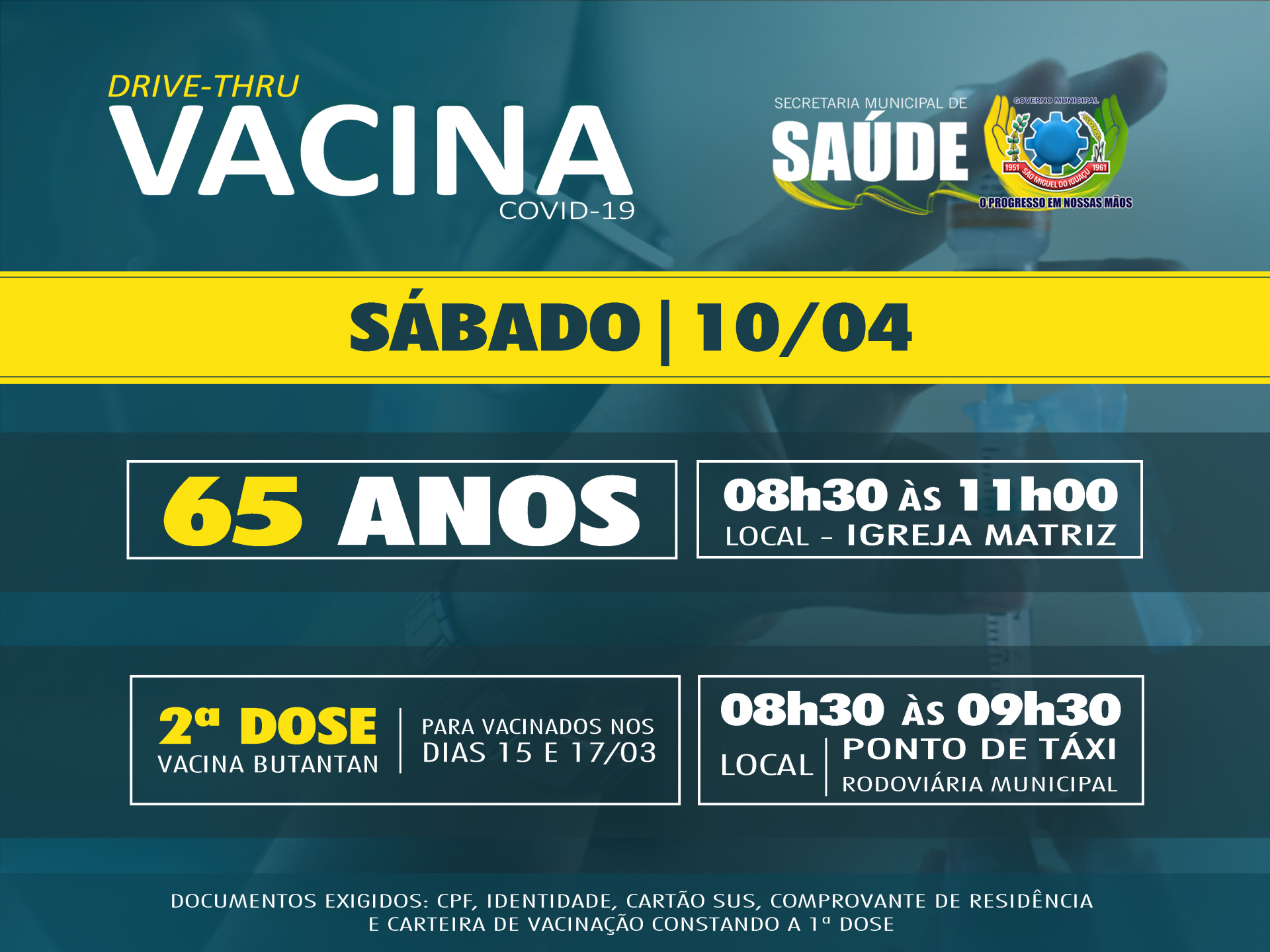 A aplicação da 2ª dose da CoronaVac Butantan vai acontecer no Ponto de Táxi da Rodoviária Municipal, no horário das 08h30 as 09h30. Para receber a vacina o idoso precisará apresentar obrigatoriamente a carteirinha de vacinação com a 1ª dose, RG, CPF e cartão do SUS.