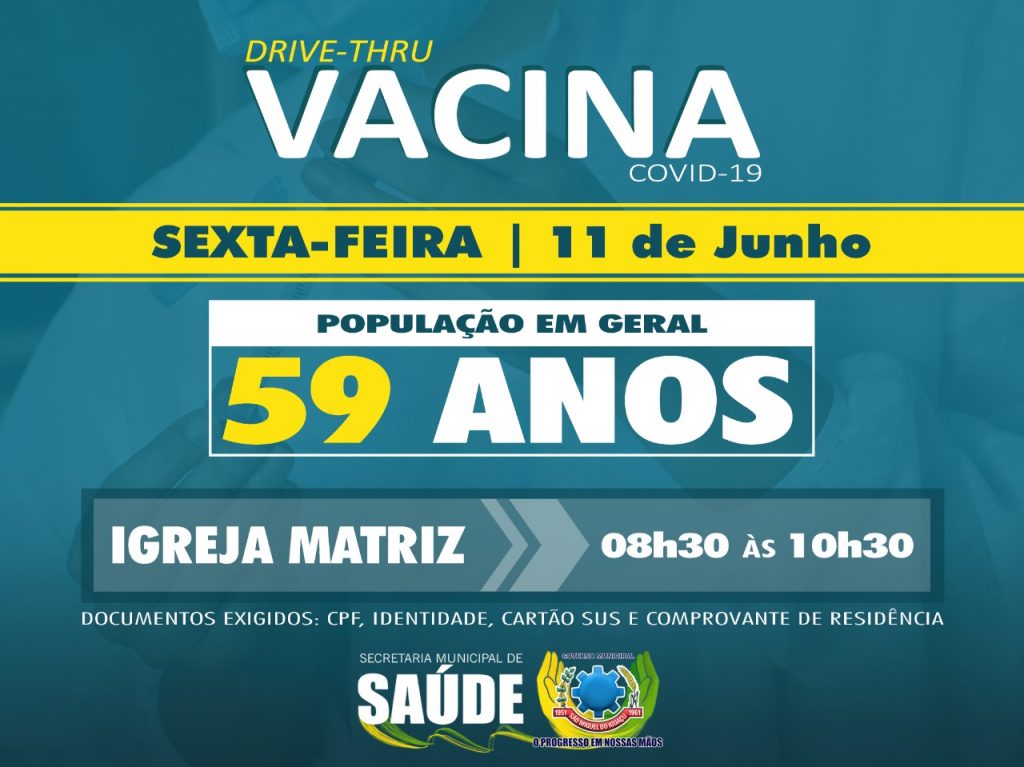 A aplicação das doses vai acontecer na Igreja Matriz, no horário das 08h30 às 10h30, no sistema drive thru, com a pessoa sendo vacinada dentro do carro. Para receber a imunização é necessário apresentar RG, CPF e comprovante de residência.