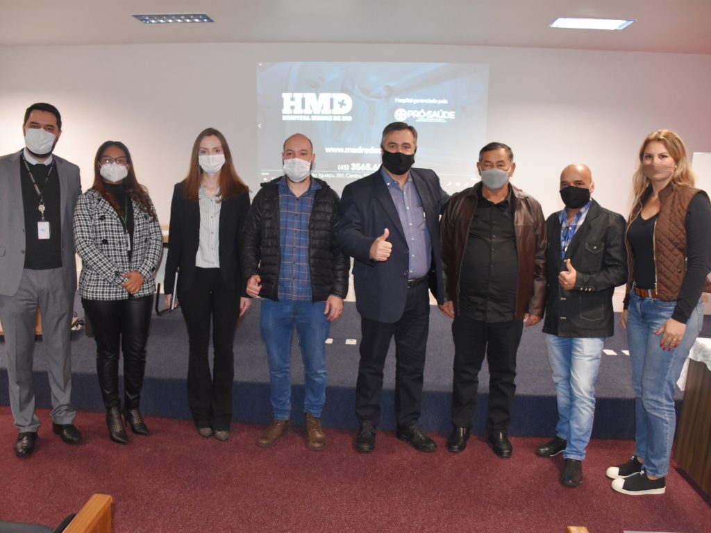 O prefeito Motta, e os secretários municipais de Saúde, Carline Slovinski Acordi Garcia, e de Administração, Marcelo Martins de Castro, além dos vereadores Raulique Farias e Juliane Dandolini, acompanharam a recepção do secretário, que aconteceu Hospital Madre de Dio.