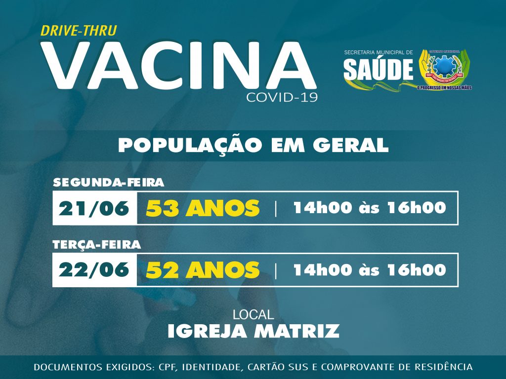 Lembrando neste sábado, dia 19 de junho, será aplicada a 1ª dose na população de 55 e 54 anos. As doses serão aplicadas na Igreja Matriz, no sistema drive thru, no horário das 08h30 as 11h30.
