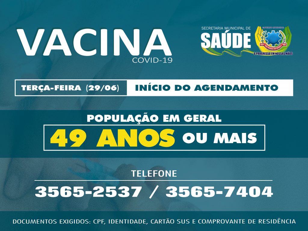 A secretaria municipal de Saúde de São Miguel do Iguaçu está iniciando nesta terça-feira, dia 29 de junho, o agendamento da vacina contra Covid-19 para a população em geral com idade a partir dos 49 anos, dando sequência ao Plano Estadual de Vacinação.