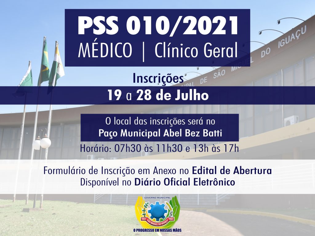 O Governo Municipal de São Miguel do Iguaçu abriu inscrições para o Processo Seletivo Simplificado (PSS) nº010/2021, visando à contratação de médicos para atuarem nas Unidades de Urgência/Emergência, Unidades Básicas de Saúde, Unidades de Atendimento Covid-19 e Clínica de Especialidades.