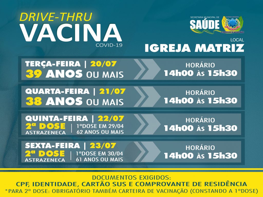 Nesta terça-feira, 20 de julho, será aplicada a 1ª dose na população em geral de 39 anos ou mais e na quarta-feira, 21, nas pessoas com idade a partir dos 38 anos.