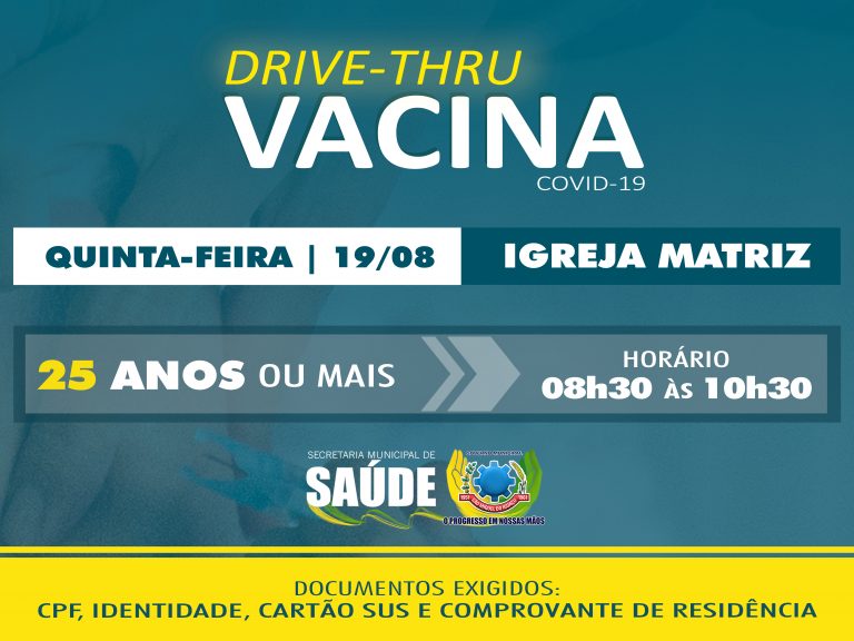 A imunização será realizada na Igreja Matriz, seguindo o modelo drive thru, com a pessoa sendo vacinada dentro do carro, no horário das 08h30 às 10h30.