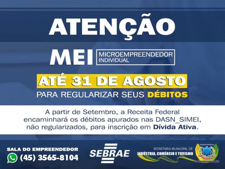 A Sala do Empreendedor de São Miguel do Iguaçu, vinculada à secretaria municipal de Indústria, Comércio e Turismo, está alertando os Microempreendedores Individuais (MEI’s) que estão devendo impostos, como INSS, ISS e ICMS, que o prazo para regularizar suas dívidas é o próximo dia 31 de agosto.