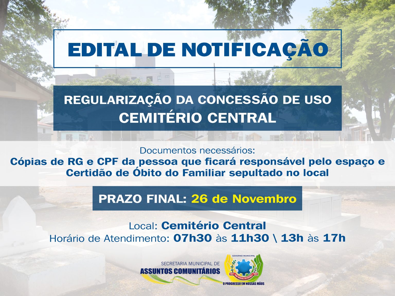 Com isso, responsáveis por sepulturas, túmulos, gavetas e/ou jazigos que tenham familiares sepultados no Cemitério Central, deverão realizar a regularização até o dia 26 de novembro de 2021. Os mesmos deverão comparecer junto ao próprio cemitério, no horário das 07h30 às 11h30 e das 13h00 às 17h00, munidos de cópia do RG e CPF da pessoa que ficará responsável pelo espaço e cópia da Certidão de Óbito do(s) familiar (es) sepultado (s) no local.
