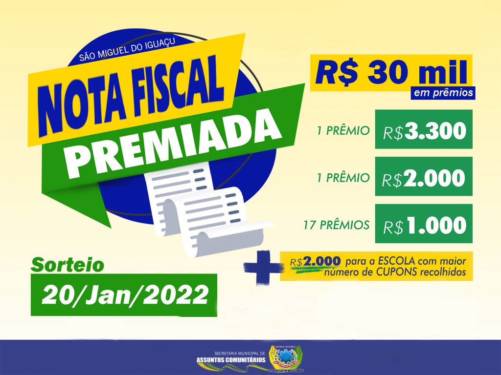 O Governo Municipal de São Miguel do Iguaçu, por meio da secretaria de Assuntos Comunitários, realiza na próxima quinta-feira, 20 de janeiro, o sorteio da campanha Nota Fiscal Premiada, que vai distribuir R$ 30mil em prêmios.