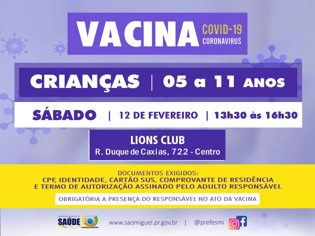 A secretaria municipal de Saúde de São Miguel do Iguaçu vai realizar neste sábado, 12 de fevereiro, a vacinação contra a Covid-19 para todas as crianças com idade entre 05 e 11 anos.