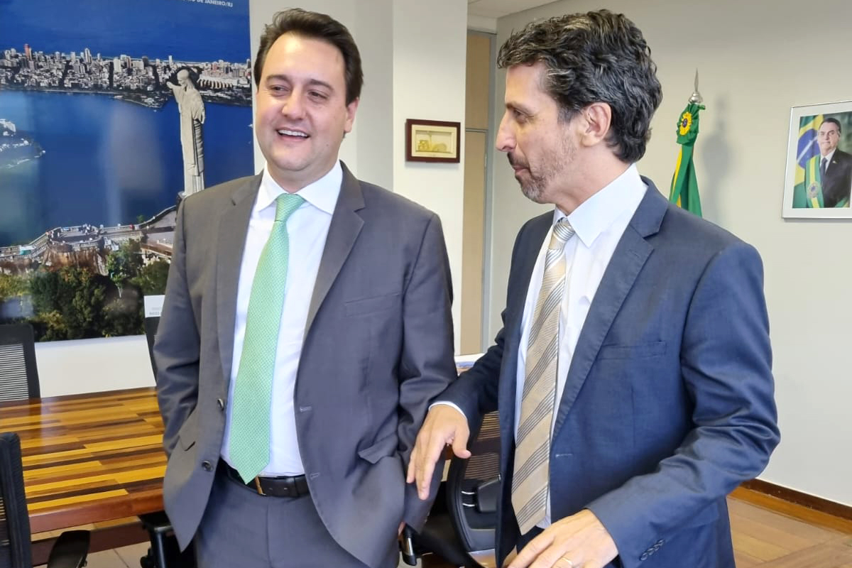 O governador Carlos Massa Ratinho Junior se reuniu nesta quinta-feira (10), em Brasília, com o ministro do Meio Ambiente, Joaquim Leite, e com presidente do Instituto Brasileiro do Meio Ambiente e dos Recursos Naturais Renováveis (Ibama), Eduardo Bim, para debater o projeto da Nova Ferroeste, estrada de ferro que ligará Maracaju, no Mato Grosso do Sul, ao Porto de Paranaguá, no litoral paranaense. Ele também apresentou as ações do programa Parque Urbanos, que investe R$ 72 milhões para criação de espaços de proteção e lazer em áreas degradas de 63 municípios.