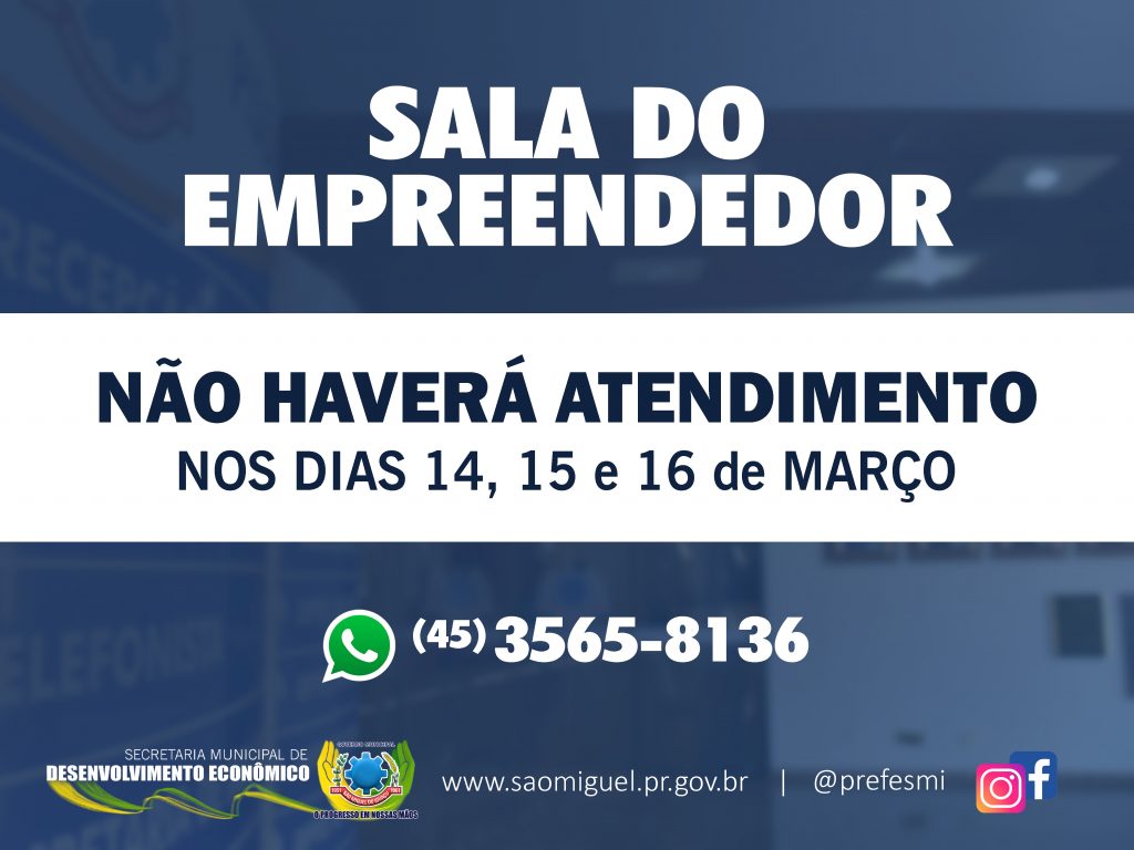 O Governo Municipal de São Miguel do Iguaçu, por meio da secretaria de Desenvolvimento Econômico, comunica que entre segunda e quarta-feira da próxima semana, dias 14, 15 e 16 de março, não haverá atendimento na Sala do Empreendedor.