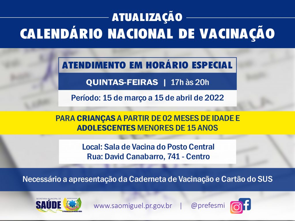 A secretaria municipal de Saúde de São Miguel do Iguaçu vai realizar um trabalho de intensificação das vacinas de rotina do Calendário Nacional de Vacinação para crianças e adolescentes entre os dias 15 de março e 15 de abril. Durante o período, será realizado um horário especial de atendimento todas as quintas-feiras, das 17h00 às 20h00, na Sala de Vacina do Posto de Saúde Central, localizado na David Canabarro, 741, Centro.