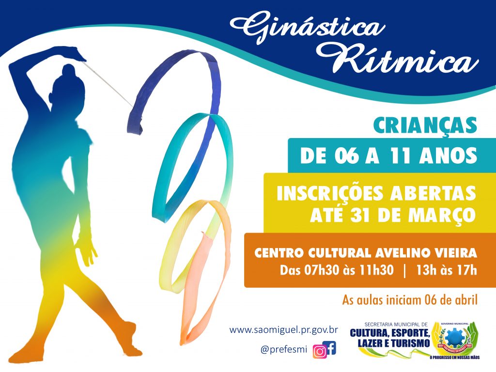 O Governo Municipal de São Miguel do Iguaçu, por meio da secretaria de Cultura, Esporte, Lazer e Turismo, está com inscrições abertas para as aulas de ginástica rítmica. A modalidade é destinada para crianças de 06 a 11 de idade (nascidas a partir de 2010, entre os meses de junho e dezembro, até o mês de junho de 2016).
