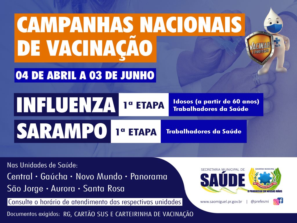 O Governo Municipal de São Miguel do Iguaçu, por meio da secretaria de Saúde, comunica que vai iniciar na próxima segunda-feira, 04 de abril, a 24ª Campanha Nacional de Vacinação contra a Influenza e também a 8ª Campanha Nacional de Seguimento e Vacinação de Trabalhadores da Saúde contra Sarampo.