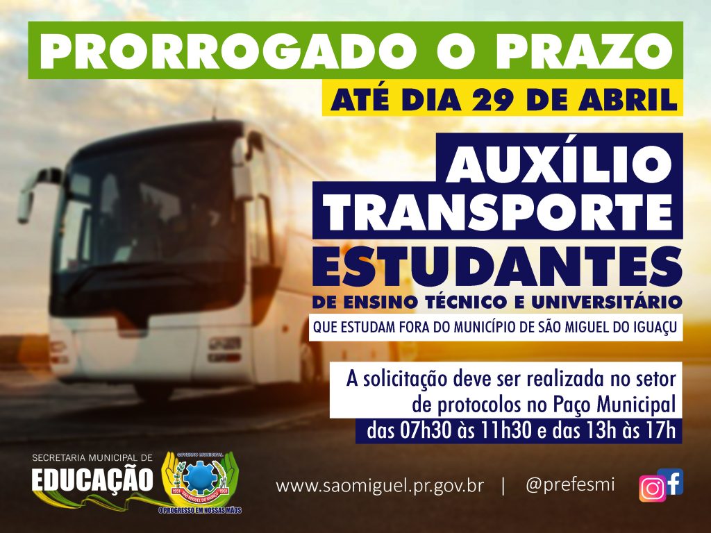 O Governo Municipal de São Miguel do Iguaçu, por meio da secretaria de Educação, informa que foi prorrogado o prazo para o chamamento público para concessão de auxílio transporte para estudantes de ensino técnico e universitário que estudam fora do município. A solicitação poderá ser feita até o dia 29 de abril, via protocolo, no setor de protocolos no Paço Municipal, no horário das 07h30 às 11h30 e das 13h00 às 17h00.