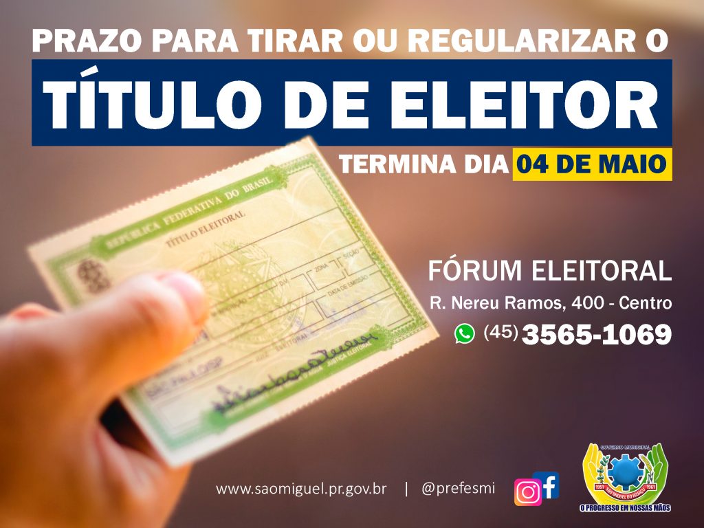 O Fórum Eleitoral de São Miguel do Iguaçu comunica que o prazo para tirar pela primeira vez o título de eleitor ou regularizar pendências termina no próximo dia 04 de maio. O prazo antecede em 150 dias as eleições de 2022, que acontecem no dia 2 de outubro (1º turno) e 30 de outubro (se houver 2º turno).