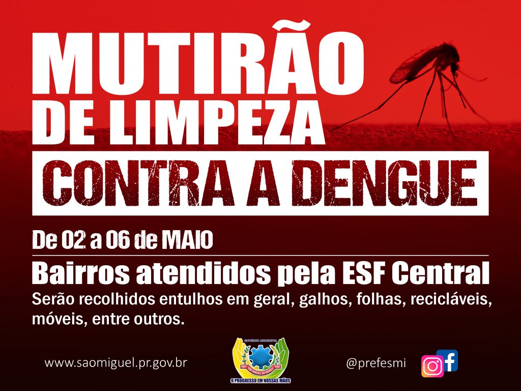 O Governo Municipal de São Miguel do Iguaçu decretou na última semana epidemia de dengue após o município chegar a 110 casos confirmados da doença. E como uma das ações de combate ao mosquito transmissor, vai iniciar na próxima segunda-feira, 02 de maio, um mutirão de limpeza. Nesta primeira semana, os trabalhos estarão concentrados no centro da cidade, na área atendida pela ESF Central.