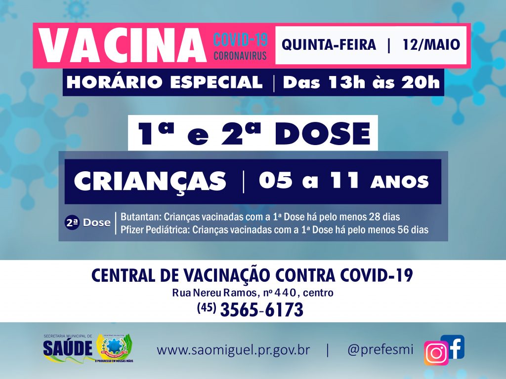 A secretaria municipal de Saúde de São Miguel do Iguaçu vai realizar nesta quinta-feira, 12 maio, um horário especial de vacinação contra Covid-19 para todas as crianças de 05 a 11 anos. Na oportunidade serão aplicadas 1ª e 2ª doses.