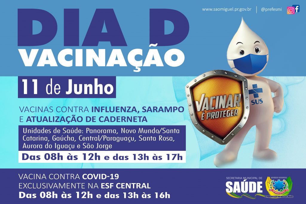 A secretaria municipal de Saúde de São Miguel do Iguaçu vai realizar neste sábado, 11 de junho, um ‘Dia D’ de vacinação para atualização de todas as vacinas. O atendimento especial vem de encontro com orientação do Ministério da Saúde e do Estado, após a prorrogação da Campanha Nacional de Vacinação contra Influenza e Sarampo, que foi estendida até o próximo dia 24 de junho, por conta da baixa cobertura vacinal.