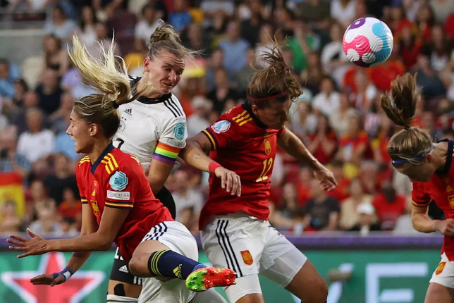Klara Bühl, revelação de 21 anos do Bayern de Munique, abriu o placar logo aos três minutos de jogo, aproveitando uma saída errada da goleira espanhola Sandra Paños. A Espanha pressionou as rivais com o seu conhecido estilo de troca de passes e teve chance de empatar com Lucia García, que chegou a driblar a goleira Merie Frohms mas ficou sem ângulo e bateu para fora. Aos 36, Popp marcou de cabeça o segundo gol alemão, após cobrança de escanteio. No segundo tempo, as alemãs reclamaram de um pênalti de Irene Paredes em Popp não marcado pela arbitragem em campo nem revisto pelo VAR.