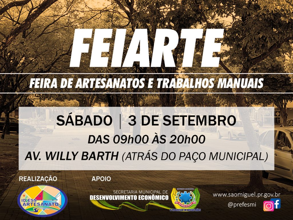 O Núcleo Setorial de Artesanato de São Miguel do Iguaçu vai realizar neste sábado, 03 de setembro, com apoio do Governo Municipal, por meio da secretaria de Desenvolvimento Econômico, a 2ª edição da Feira de Artesanatos e Trabalhos Manuais-FEIARTE.