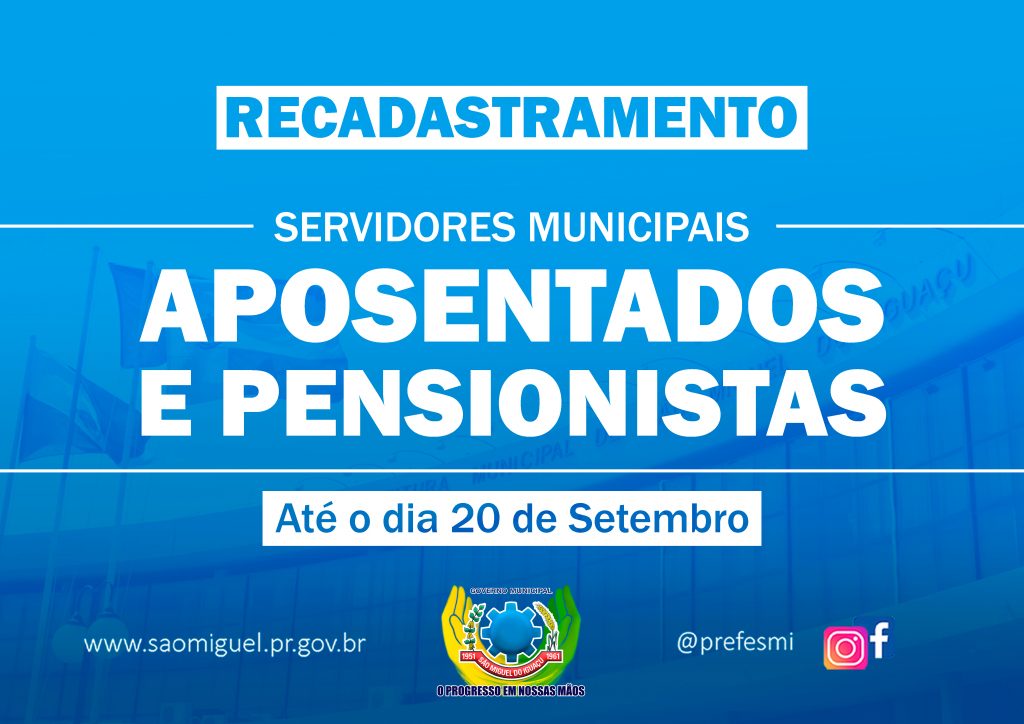 O Governo Municipal de São Miguel do Iguaçu está convocando todos os servidores municipais aposentados e pensionistas da prefeitura para o recadastramento, que será realizado até o dia 20 de setembro.