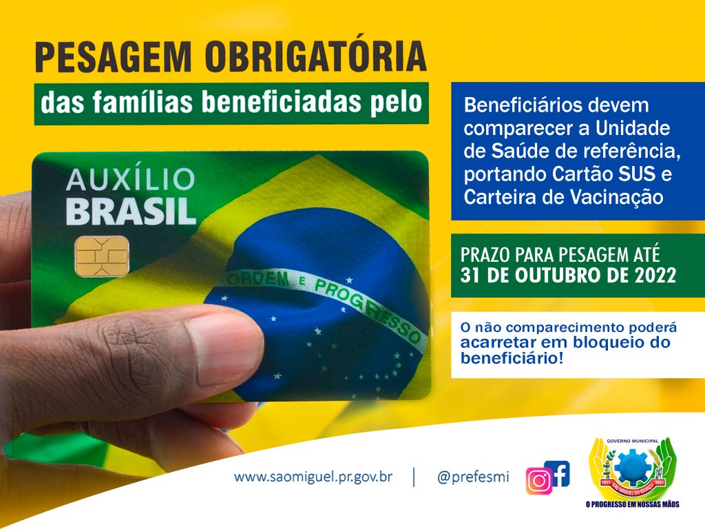 O Governo Municipal de São Miguel do Iguaçu, por meio das secretarias de Assistência Social e de Saúde, convoca os beneficiários do Auxílio Brasil, antigo Bolsa Família, para comparecerem à Unidade de Saúde mais perto de sua residência para realizar a pesagem, obrigatória para garantir o recebimento do benefício.