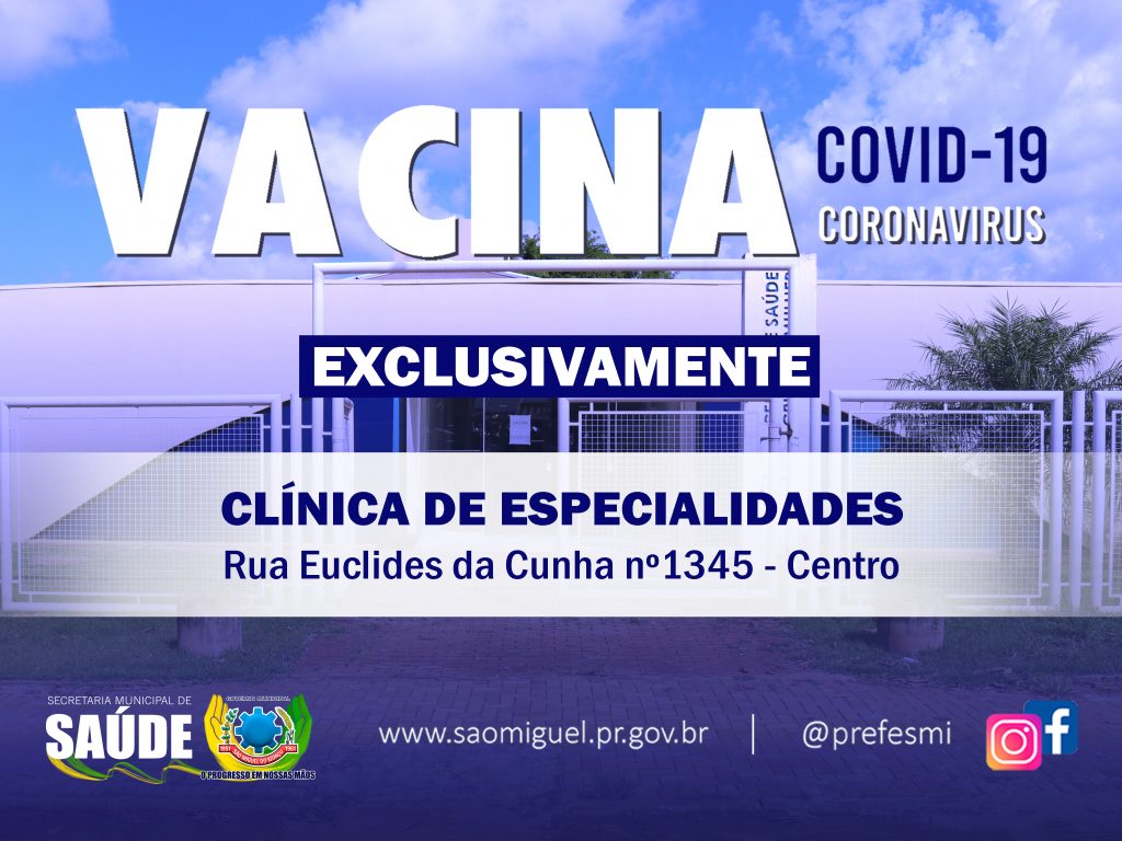 O Governo Municipal de São Miguel do Iguaçu, por meio da secretaria de Saúde, informa que as doses de vacina contra a Covid-19 passarão ser aplicadas somente na Clínica de Especialidades a partir da próxima semana.