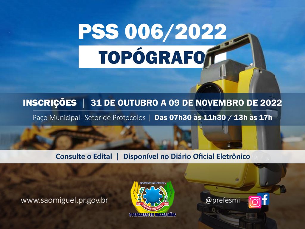 Estão abertas as inscrições do Processo Seletivo Simplificado (PSS) nº006/2022, aberto pelo Governo Municipal de São Miguel do Miguel do Iguaçu visando à contratação de topógrafo, para atuar junto à secretaria de Planejamento.