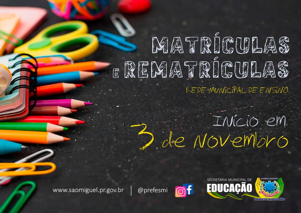 - Rematrícula da Rede Municipal de Ensino aos estudantes matriculados em 2022, no ensino fundamental de 1º ao 5º Ano, Educação Infantil Pré nível I e Pré nível II, Eja , Classe Especial, Sala de Recurso e CRECHE- todos o níveis, que prosseguirão seus estudos, no ano letivo de 2023, nas mesmas instituições de ensino da Rede Pública Municipal.