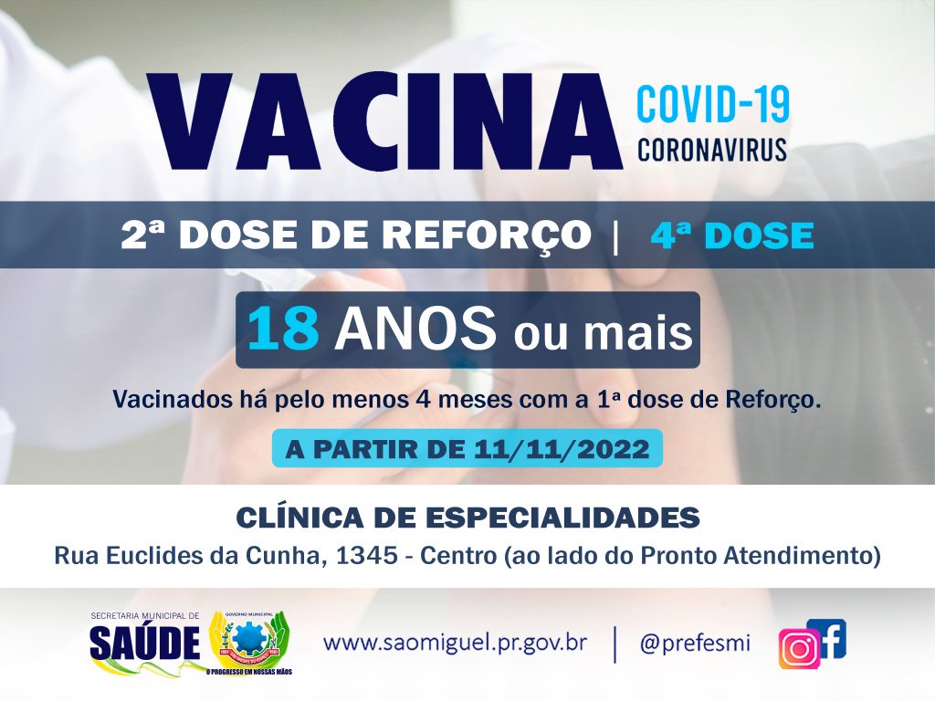 O Governo Municipal de São Miguel do Iguaçu, por meio da secretaria de Saúde, informa que vai iniciar nesta sexta-feira, 11 de novembro, a aplicação da quarta dose (ou segunda dose de reforço) da vacina contra a Covid-19 na população em geral com idade a partir dos 18 anos, que recebeu a última vacina há pelo menos quatro meses.