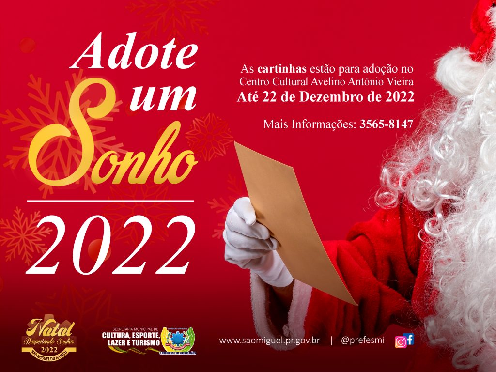 O Governo Municipal de São Miguel do Iguaçu, por intermédio da secretaria de Cultura, Esporte, Lazer e Turismo, está desenvolvendo a campanha ‘Adote um Sonho 2022’, que recebeu cartinhas escritas pelas crianças ao Papai Noel e que podem ser adotadas pela comunidade até a próxima quinta-feira, dia 22.