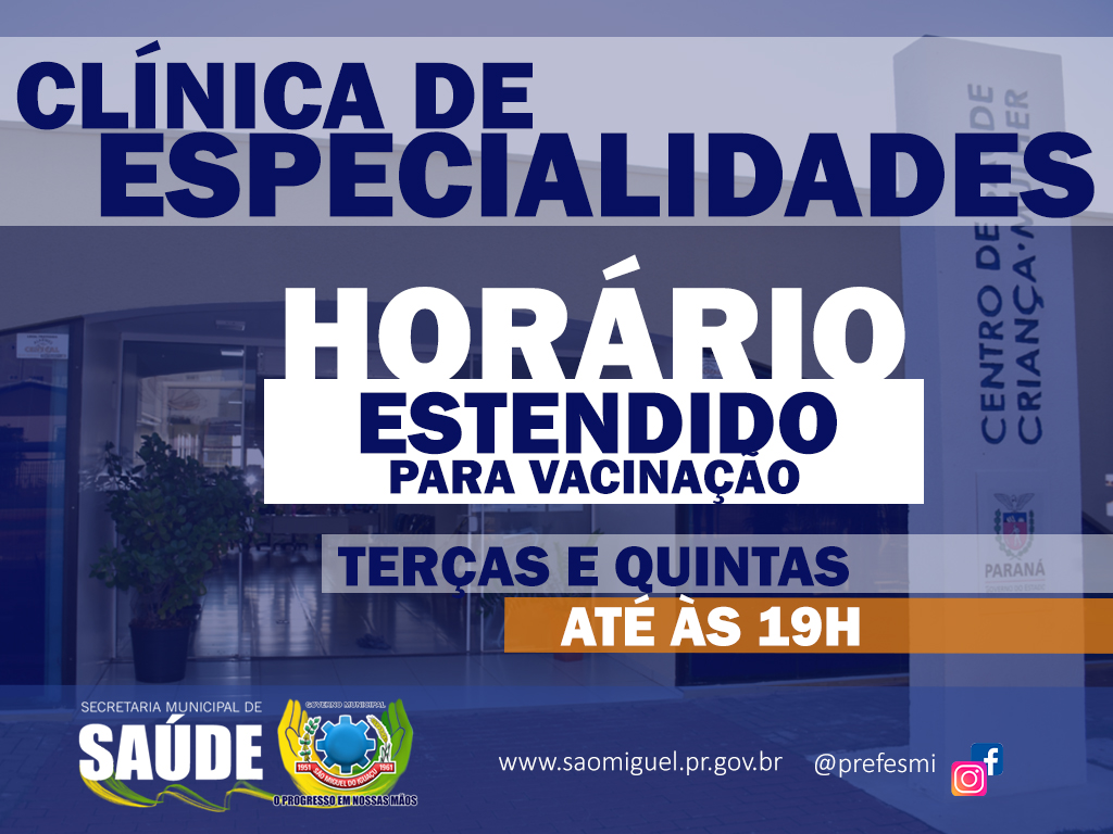 O Governo Municipal de São Miguel do Iguaçu, por intermédio da secretaria de Saúde, informa que haverá horário estendido de atendimento na Clínica de Especialidades todas as terças e quintas-feiras, seguindo até as 19h00, para aplicação de todas as vacinas do calendário nacional e da Covid-19, exceto o de Covid para crianças menores de 12 anos e BCG, que deverão ser agendadas pelo 3565-8150.