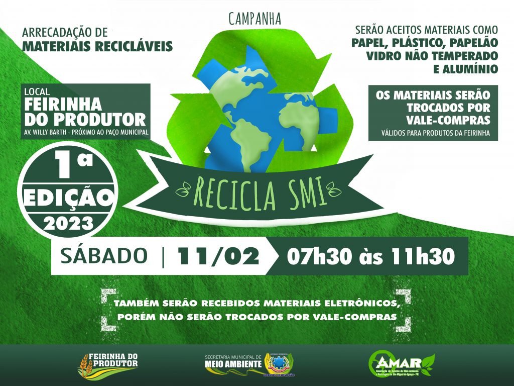 O Governo Municipal de São Miguel do Iguaçu, por intermédio da secretaria de Meio Ambiente, vai realizar neste sábado, 11 de fevereiro, em parceria com a AMAR (Associação dos Agentes de Meio Ambiente e Reciclagem) e os feirantes da Feira do Produtor, a primeira edição do ano da campanha Recicla SMI.