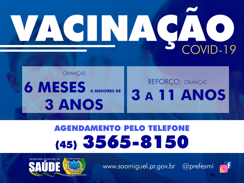 A secretaria municipal de Saúde de São Miguel do Iguaçu deu início ao agendamento para aplicação da vacina contra a Covid-19 para crianças de 6 meses a menores de 3 anos (2 anos 11 meses e 29 dias) e de reforço para crianças de 03 a 11 anos pelo telefone 3565-8150.