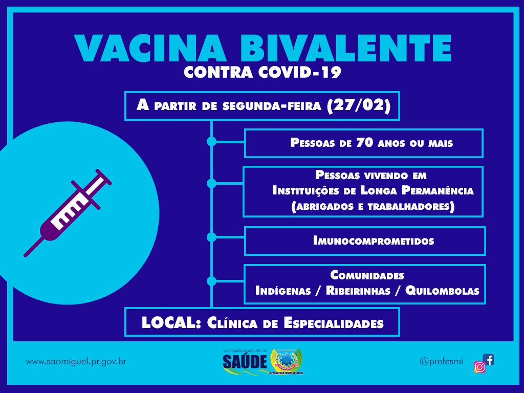 O Governo Municipal de São Miguel do Iguaçu, por intermédio da secretaria de Saúde, vai iniciar na próxima segunda-feira, 27, a campanha de vacinação bivalente contra a covid-19 com doses do imunizante da Pfizer. A aplicação das doses será realizada na Clínica de Especialidades, que está localizada na Rua Euclides da Cunha, n° 1345, centro, ao lado do Pronto Socorro do Hospital e Maternidade Municipal São Miguel Arcanjo.
