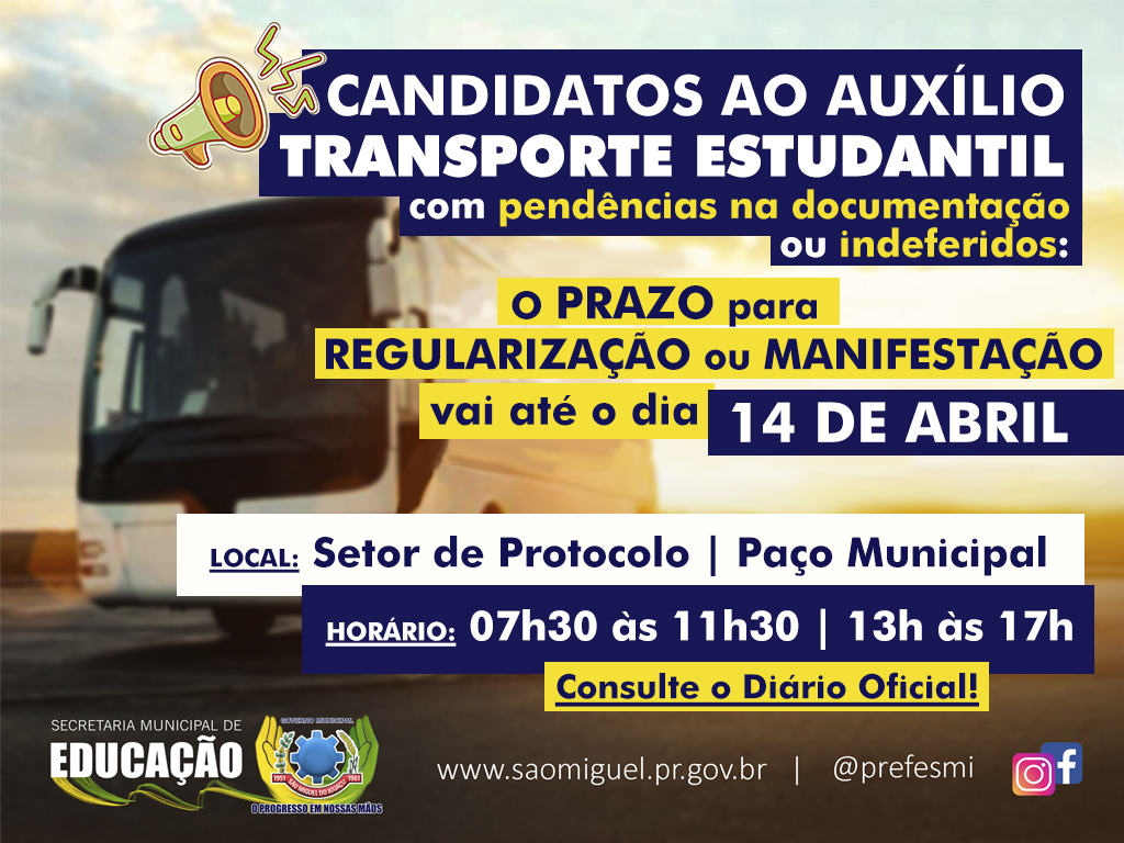 O Governo Municipal de São Miguel do Iguaçu publicou no Diário Oficial Eletrônico (DOE) da última segunda-feira, 10 de abril, a lista de estudantes que se cadastraram para receber o Auxílio Transporte Estudantil que estão com pendências na documentação ou foram considerados inaptos a receberem o benefício.