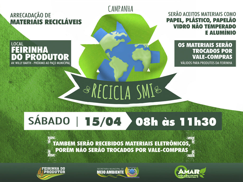 O Governo Municipal de São Miguel do Iguaçu, por intermédio da secretaria de Meio Ambiente, vai realizar neste sábado, 15 de abril, em parceria com a AMAR (Associação dos Agentes de Meio Ambiente e Reciclagem) e os feirantes da Feira do Produtor, a edição mensal da campanha Recicla SMI.