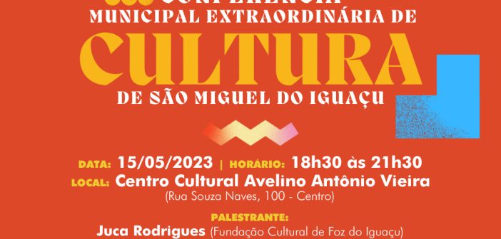 O Governo Municipal de São Miguel do Iguaçu, por intermédio da secretaria de Cultura, Esportes, Lazer e Turismo, está convocando artistas, agentes culturais, gestores públicos, professores, empresários e comunidade em geral para a Conferência Municipal Extraordinária de Cultura que será realizada no dia 15 de maio, das 18h30 às 21h30, nas dependências do Centro Cultural Avelino Antonio Vieira, situado na Rua Souza Naves, 100, Praça do Migrante, Centro.