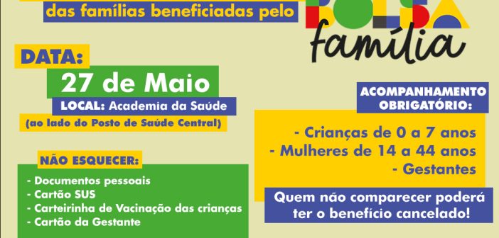 O Governo Municipal de São Miguel do Iguaçu, por intermédio da secretaria de Saúde, vai realizar o ‘Dia D’ de pesagem do programa Bolsa Família no próximo dia 27 de maio, na Academia da Saúde, localizada ao lado do Posto de Saúde Central. As famílias que não realizarem a pesagem correm o risco de perder os benefícios sociais aos quais são contempladas..