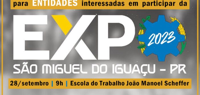 O Governo Municipal de São Miguel do Iguaçu está convidando todas as entidades do município interessadas em fazer parte da Expo São Miguel 2023 para uma importante reunião que será realizada no próximo dia 28 de setembro, as 09h00, na Escola do Trabalho João Manoel Scheffer.