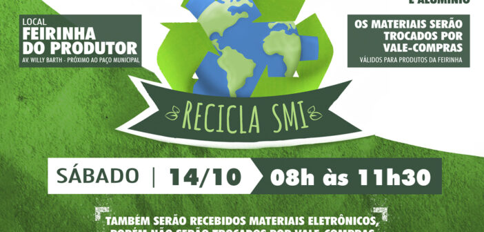 O Governo Municipal de São Miguel do Iguaçu, por intermédio da secretaria de Meio Ambiente, vai realizar neste sábado, 14 de outubro, em parceria com a AMAR (Associação dos Agentes de Meio Ambiente e Reciclagem) e os feirantes da Feira do Produtor, a edição mensal da campanha Recicla SMI.